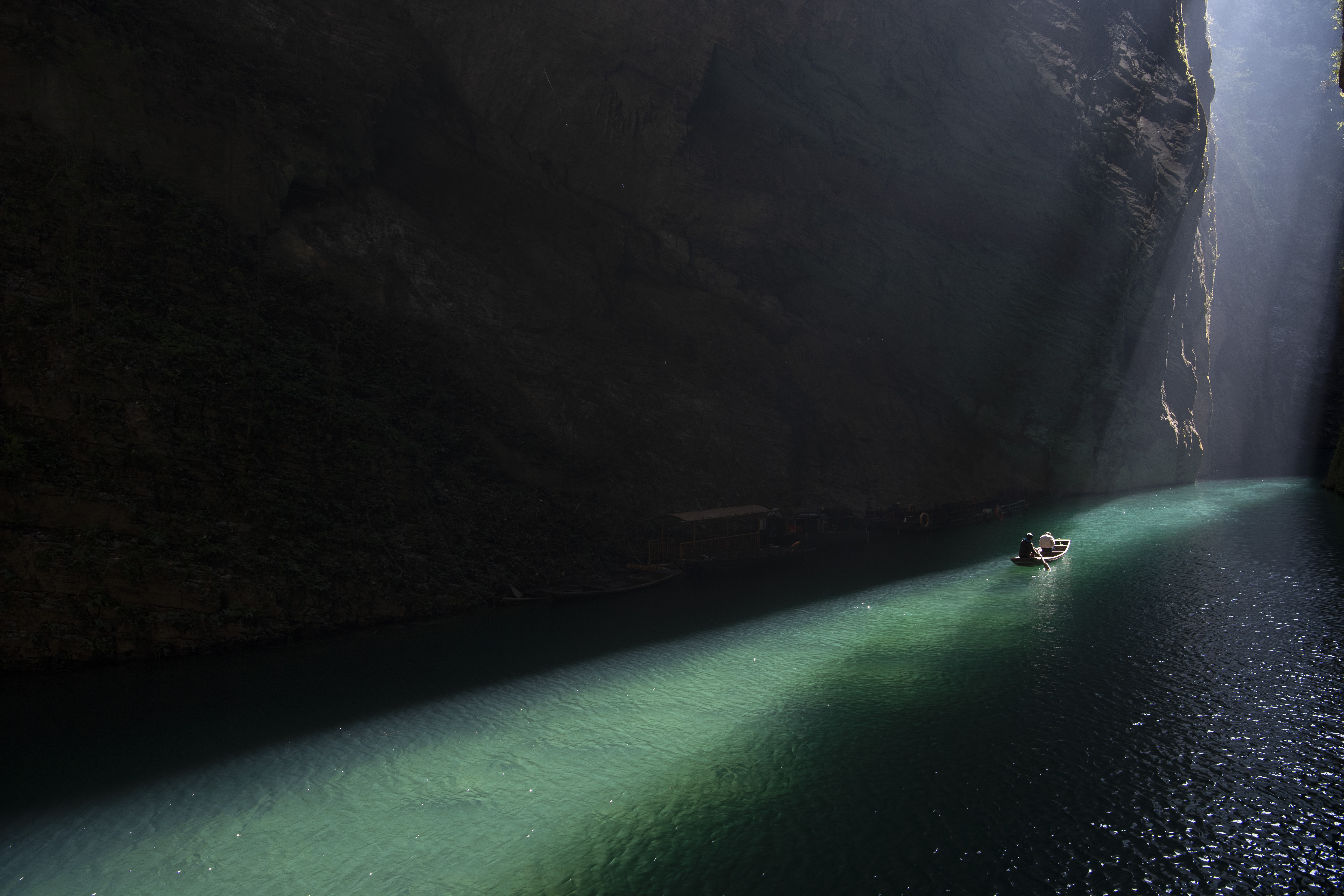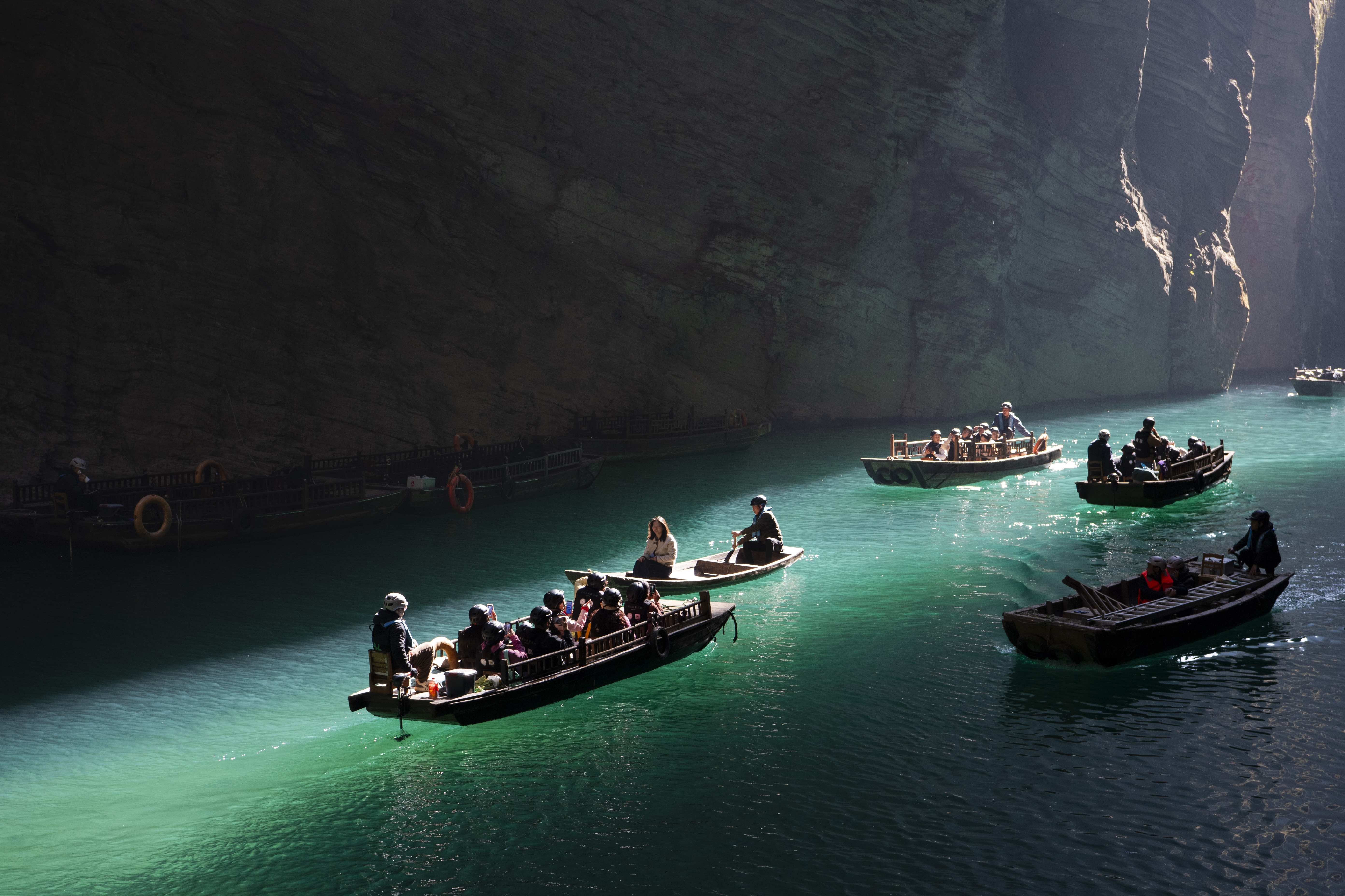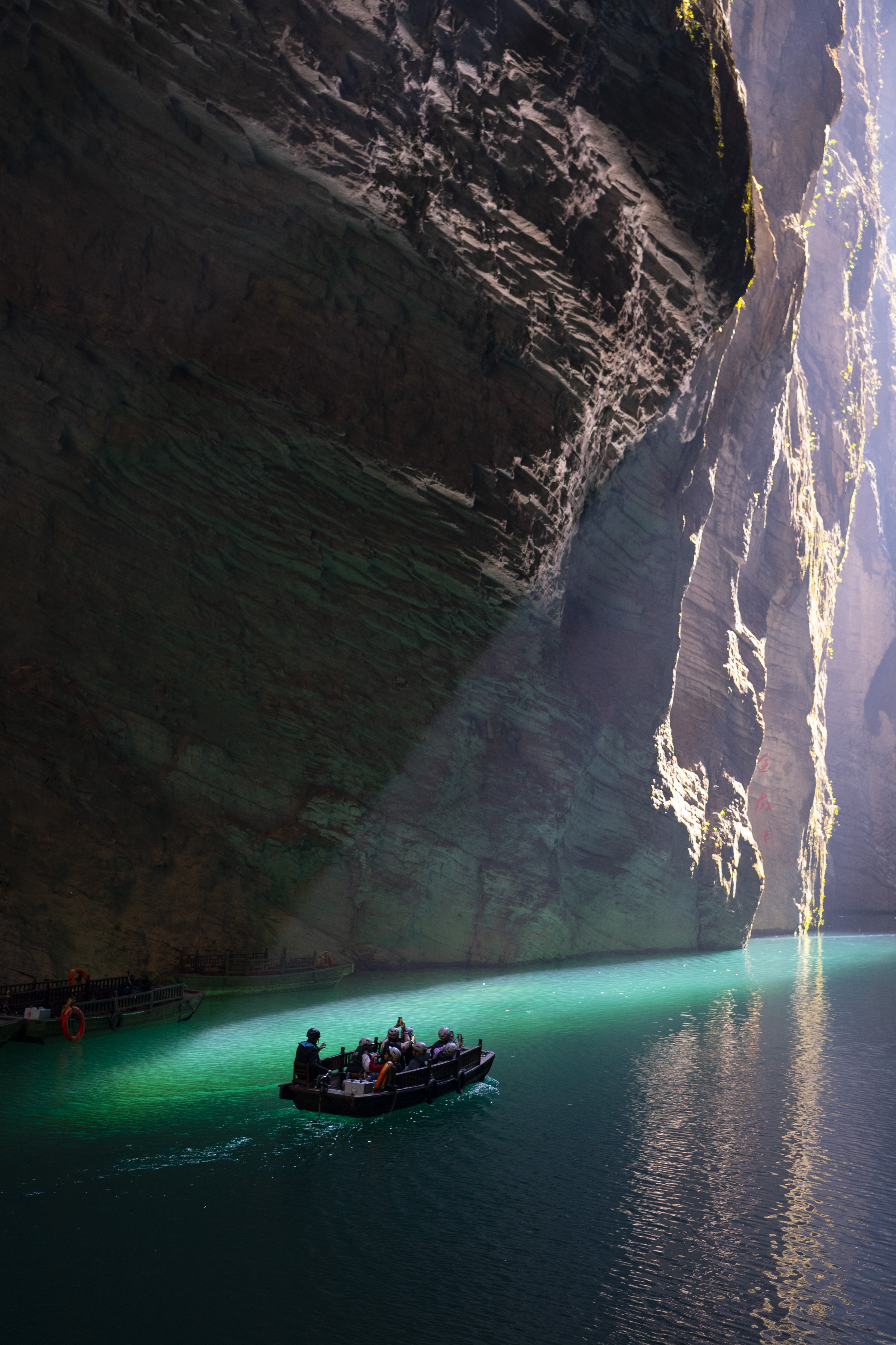 初冬时节,湖北省恩施土家族苗族自治州鹤峰县屏山峡谷迎来迷人景观。正午时分,阳光穿过幽深地缝,将蜿蜒的“一线天”照亮,舟行水上若悬浮于空中,形成了独特的“舟浮空中”奇观,吸引了众多游客前来打卡,已成为当地推动生态旅游、促进乡村振兴的亮丽名片。(杨顺丕 丁慧玲 摄)